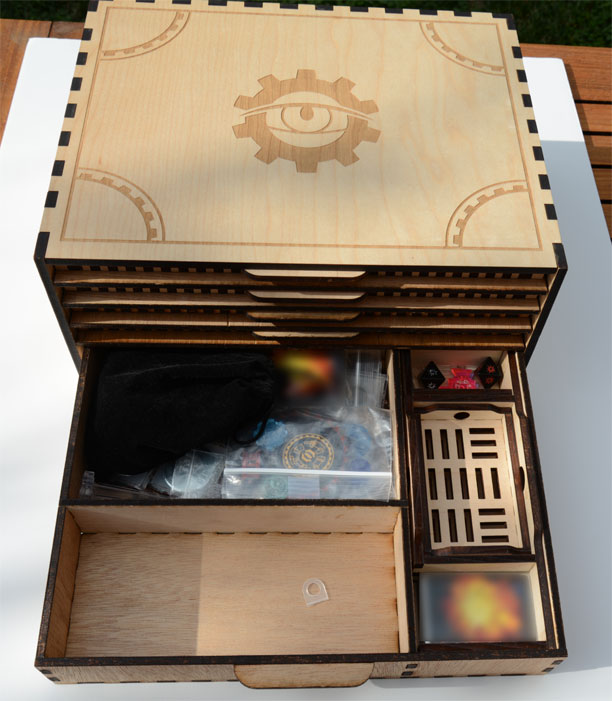 If you're looking for a more sophisticated storage solution, look no further. This Tournament Box features 4 customizable tray drawers and a bits drawer to hold everything you could possibly need to kick your opponents' asses. These drawers include foam inserts customized to hold whatever you need for your game, should it be a template organizer, a card organizer, or just a medal display. The bits drawer includes the Deck and Template Caddy (also available separately) and features a space to tuck the caddy in snugly.